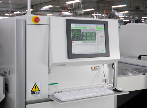 外観検査装置9台をインライン、オフラインに配置してSMTラインの品質を監視し、そのデータをフィードバックして高い基板実装品質を維持しています。